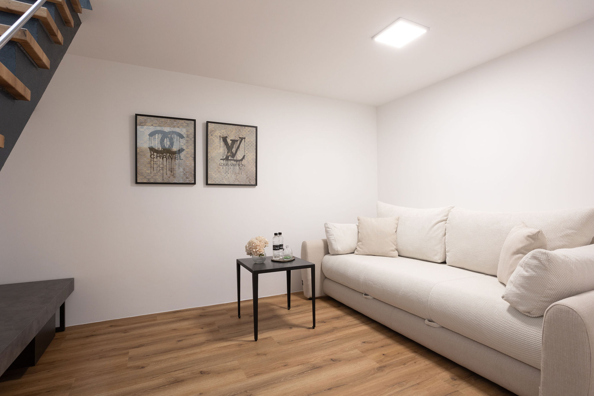 Fashion icons in the green oasis of Mengeš! Enjoy an unforgettable stay in a luxuriously furnished, stylish two-story room with furniture by Velana Living. The highlight of this elegant room is the skylight above the bed, offering a view of the starry sky. The room includes a bathroom with all necessary amenities, a living room, and a bedroom on the upper floor.